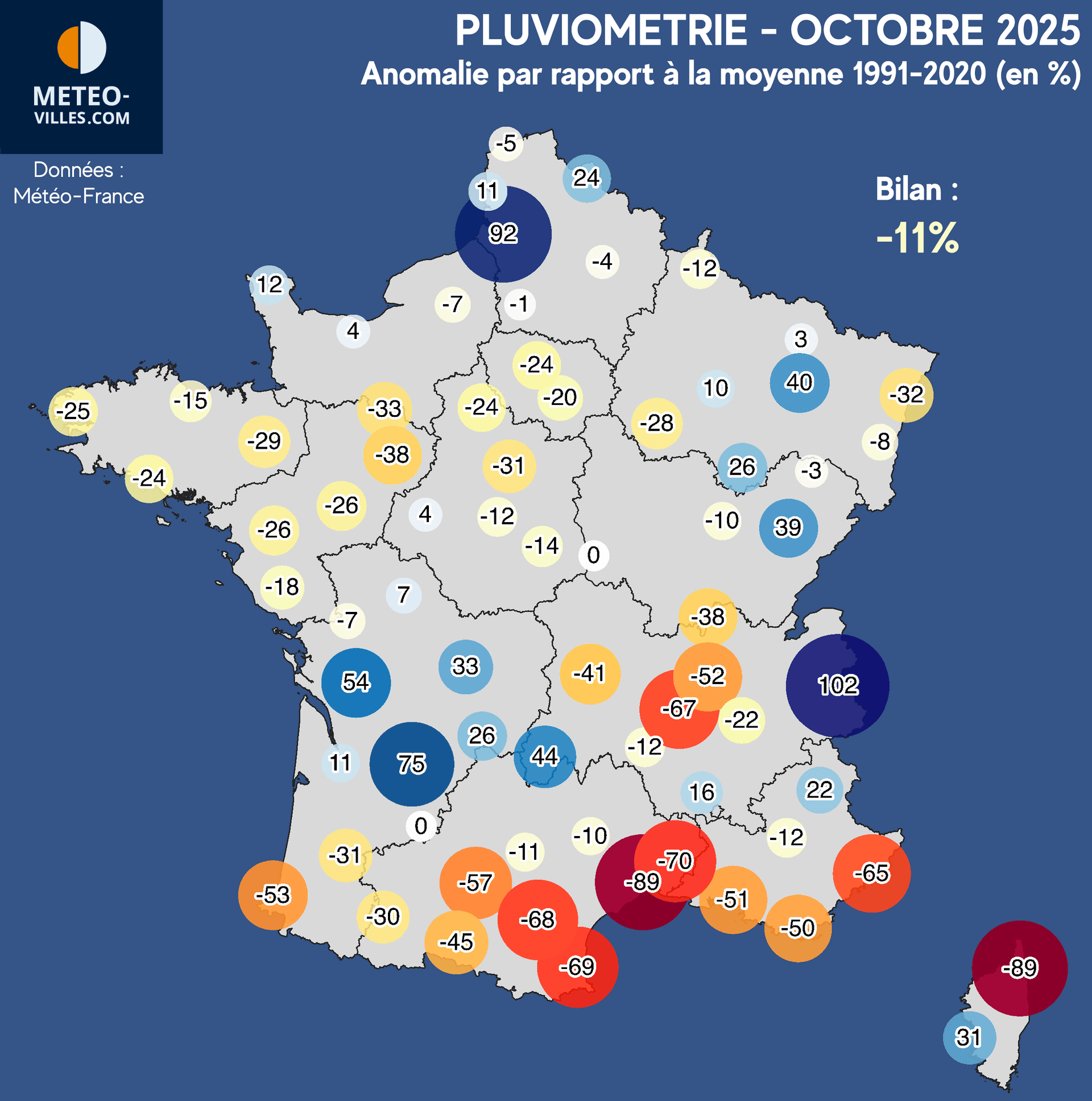 Comme à chaque début de mois, nous vous proposons un nouveau bilan climatologique. Place désormais au bilan cartographié d'OCTOBRE 2025 en termes de température, pluviométrie et ensoleillement sur un panel de 73 stations*. Les anomalies présentées sont calculées à partir des moyennes climatiques de la période de référence 1991-2020 sur l'ensemble des stations du panel.