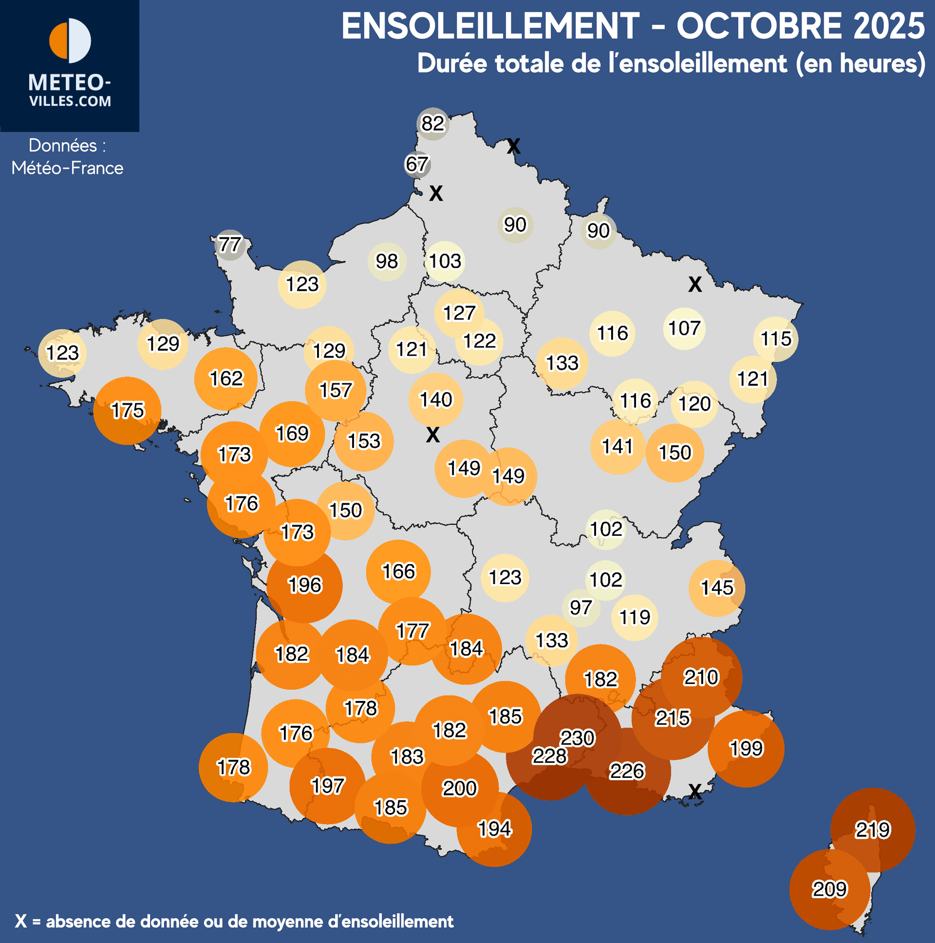 Le dégradé est alors notable entre les régions du Nord et de l'Est, par rapport aux villes de l'Ouest et du Sud de la France. Dans le Nord et le Nord-Est, le soleil a peiné à briller plus de 100 heures en cumulé... seuil qui n'a pas été atteint dans les Ardennes (90h à Charleville-Mézières), Hauts-de-France (82h à Calais, 67h au Touquet) ou dans la Manche (77h à Cherbourg). Situation peu ou prou similaire dans le Centre-Est avec 102h sur Lyon et 97h à St-Etienne.