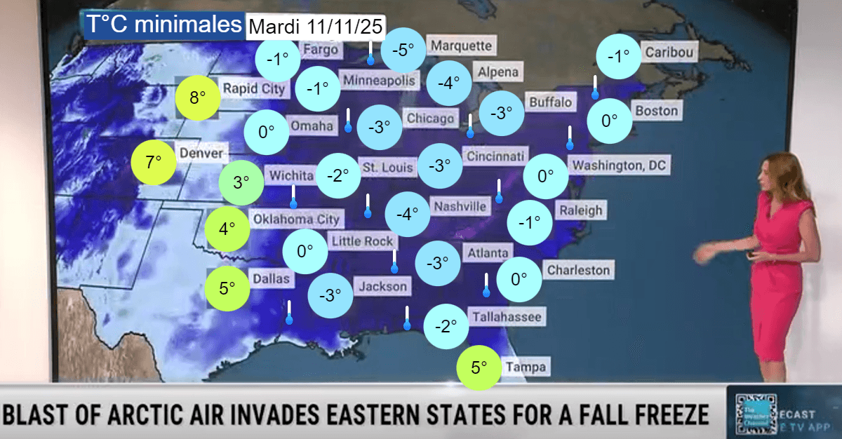 Comme nous ne sommes qu'en première partie du mois de novembre, il n'est pas prévu de froid très intense. Pour autant, les températures vont s'abaisser à des niveaux dignes du plein hiver avec des gelées qui devraient concerner près des deux tiers des USA en début de semaine prochaine ! La chaîne météo américaine indique que plus de 150 millions d'américains vont connaître des températures négatives ! En matinée du mardi 11 novembre 2025, il devrait geler jusqu'au nord de la Floride et on relèvera -3 à -5°C dans de nombreuses grandes villes du nord et de l'est des USA !