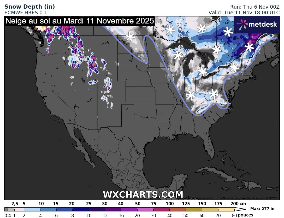 Neige au sol envisagée aux USA pour le mardi 11 novembre 2025 - wxcharts.com