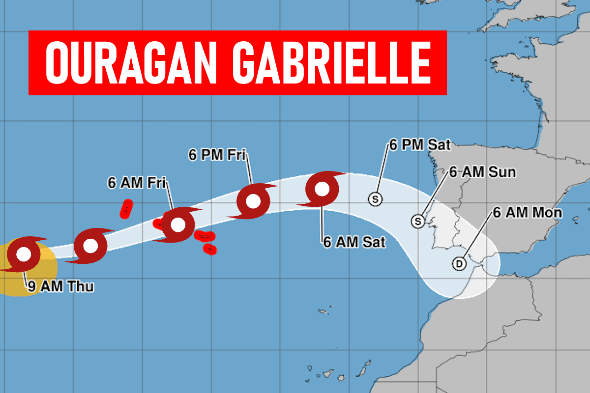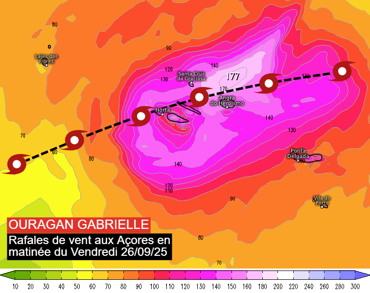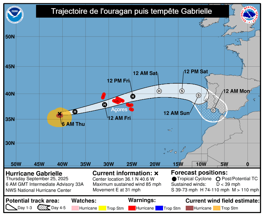 Gabrielle touchera l'archipel des Açores ce vendredi 26 septembre 2025 en matinée, en tant qu'ouragan de catégorie 1. On redoute des rafales de vent atteignant 150 à 180 km/h dans le centre de l'archipel. Certaines modélisations vont même jusqu'à 200 km/h ! Les îles les plus exposées sont celles de Faial, Pico, São Jorge, Graciosa et Terceira. Les services météo portugais ont placé ces îles en vigilance rouge ce vendredi de minuit jusqu'à midi.