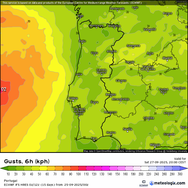 Comme évoqué, Gabrielle faiblira après son passage sur les Açores et perdra son statut d'ouragan. Elle ne sera plus qu'une dépression post-tropicale au moment de toucher le Portugal continental. Ainsi, il n'est pas prévu de vents tempétueux sur le pays et selon la plupart des scénarios, les rafales ne devraient pas excéder 60-70 km/h sur les côtes portugaises ce dimanche (les plus importantes sont prévues au large). Toutefois, la météo s'annonce agitée avec le passage d'averses et d'orages sur le pays.
