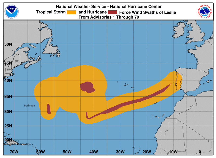 Le cas le plus remarquable est toutefois celui de Leslie, en octobre 2018. Même si l'ouragan n'avait jamais dépassé la catégorie 1, il avait eu une longue vie de plus de trois semaines sur l'Atlantique. Si Leslie fut aussi exceptionnel, c'est parce que l'ouragan avait conservé son statut jusqu'aux portes de l'Europe ! Malgré son déplacement au dessus d'eaux à 20°C, Leslie n'avait perdu son statut d'ouragan qu'à 135 km au sud-ouest de Porto ! Jamais un ouragan ne s'était autant rapproché des côtes européennes ! Leslie était encore une forte tempête au moment de toucher le Portugal. On avait relevé jusqu'à 176 km/h sur la côte en soirée du 13 octobre 2018 ! 300.000 foyers avaient été privés d'électricité et le bilan fut d'un mort et 28 blessés.