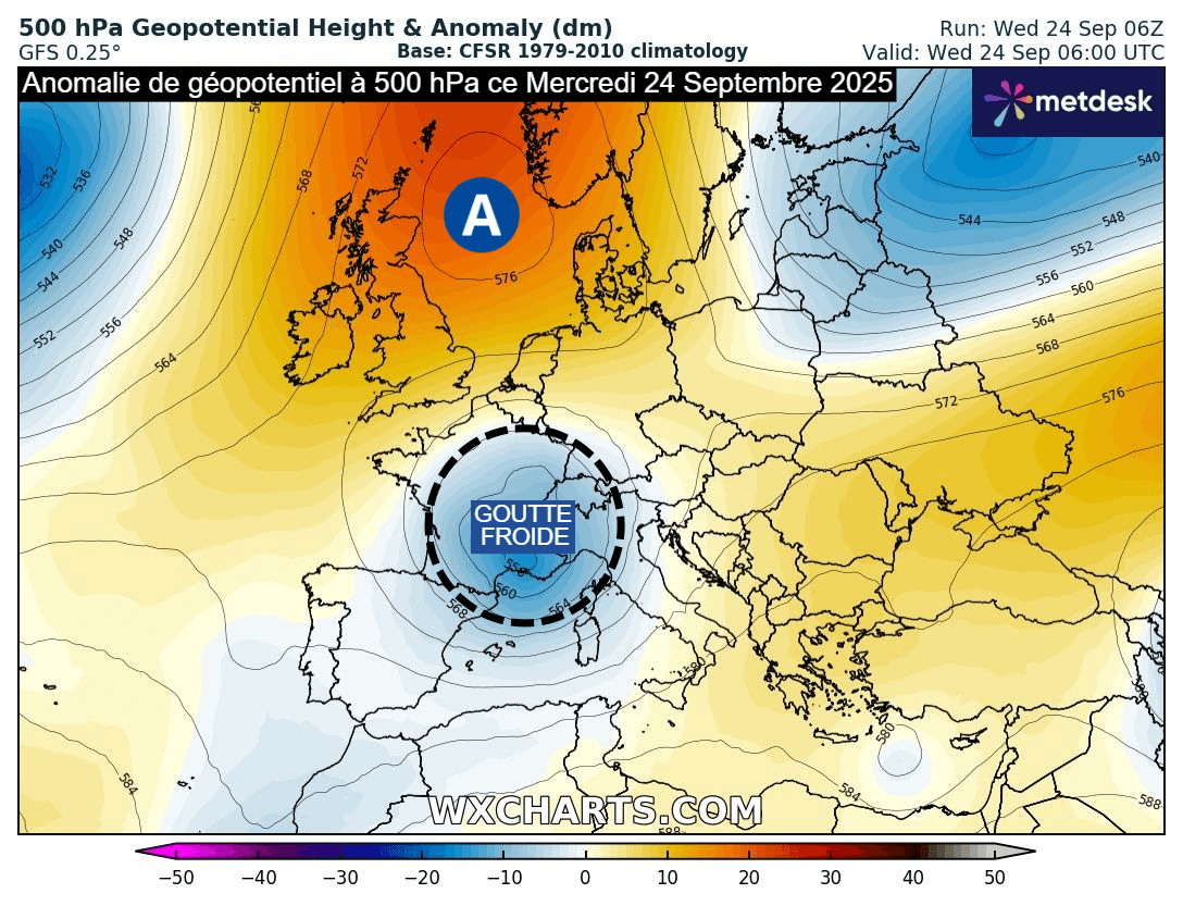 Goutte froide au dessus de la France ce mercredi 24 septembre 2025 - wxcharts.com