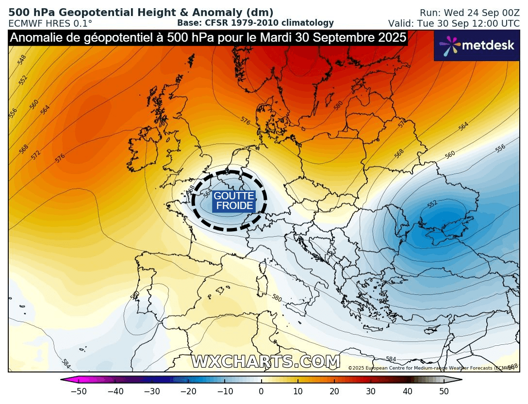 Goutte froide possible sur le nord de la France le mardi 30 septembre 2025 - wxcharts.com
