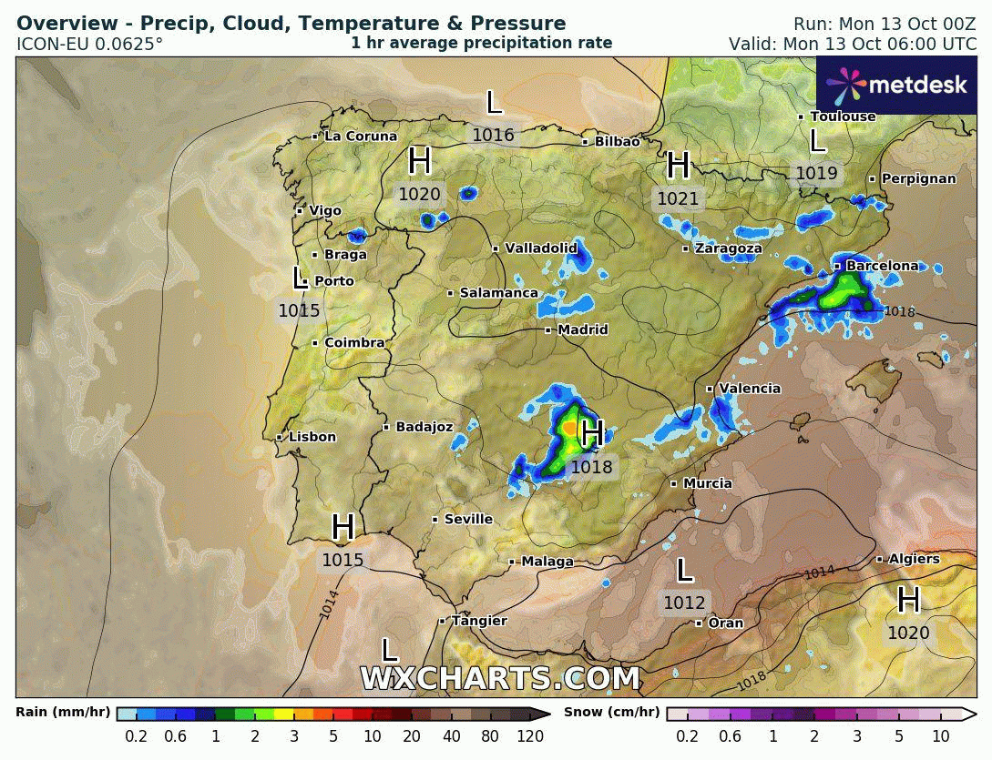 Animation des précipitations sur l'Espagne du 13 au 15 octobre 2025 - Modèle ICON-EU via WX CHARTS