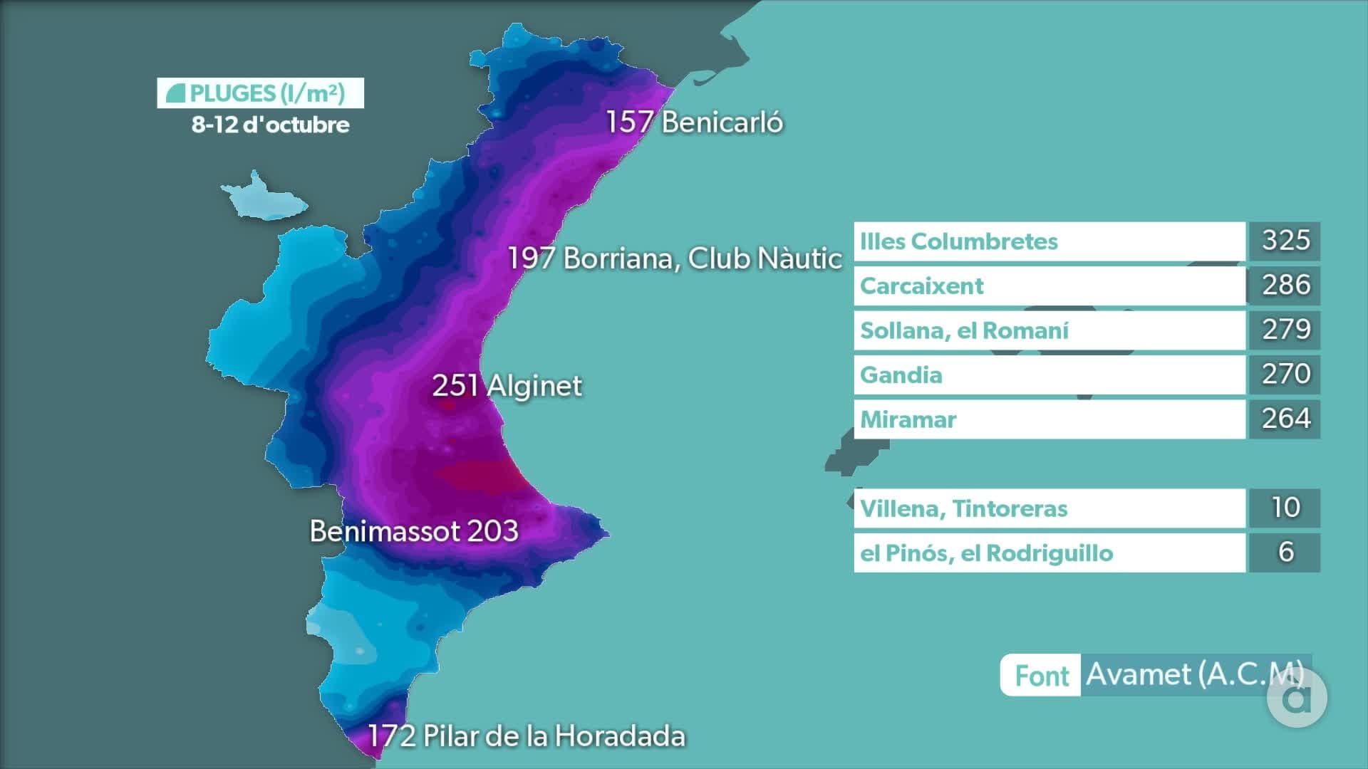 Dans la province de Valence par exemple, les cumuls dépassent localement les 300mm en moins de 5 jours avec jusqu'à 325mm à Illes Columbretes.