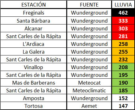 Cet orage diluvien aura ainsi déversé plus de 300 à 400mm en seulement quelques heures sur ces secteurs avec jusqu'à 462mm à Freginals ou encore 333mm à Santa Barbara.