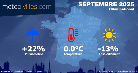 Et pourtant, septembre vous a paru particulièrement frais ? Ceci peut s'expliquer par un important contraste entre la première et la seconde partie du mois. Bien que fluctuantes, le thermomètre affichait encore régulièrement des valeurs estivales durant les deux premières décades (+0.9°C du 1er au 20 septembre), avec même un pic de fortes chaleurs les 18 et 19 septembre (jusqu'à 35.2°C à Bordeaux ou encore 30.4°C pour Paris >>).