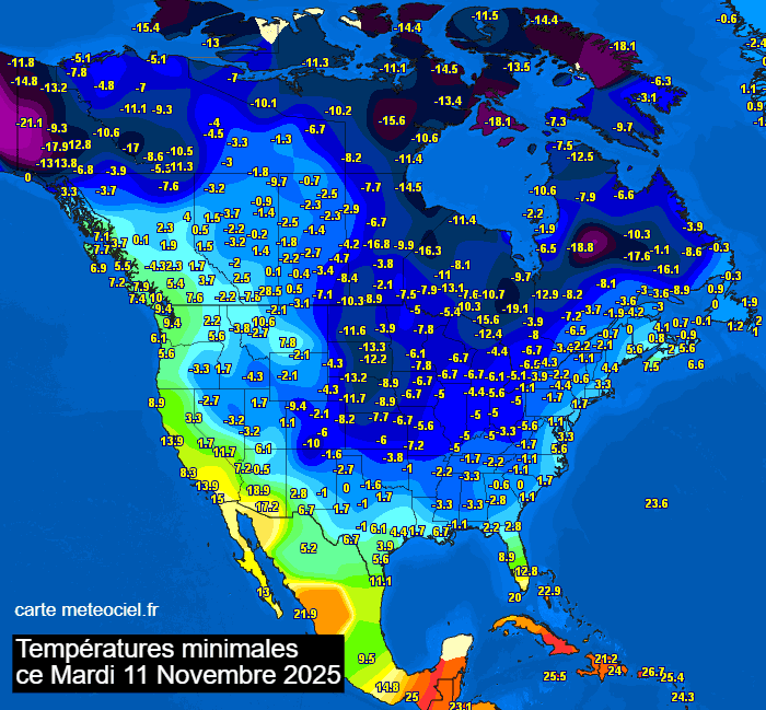 Températures minimales mesurées en Amérique du Nord ce mardi 11 novembre 2025 - meteociel.fr