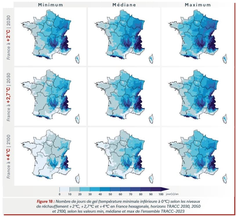 Avec l'évolution future des températures, le froid devrait se montrer de moins en moins fréquent durant l'hiver avec des gelées de moins en moins étendues à travers le pays. Par exemple, si on relevait 36 jours de gel en moyenne à Lille entre 1976 et 2005, ces gelées ne se produiront que 19 jours par an dans une France à +2,7°C et 13 jours dans une France à +4°C. A Paris, on passerait de 21 jours de gel en moyenne entre 1975 et 2005 à seulement 6 jours dans une France à +4°C, à Lyon de 43 jours à seulement 14 jours et à Marseille de 5 jours à 1 jour.